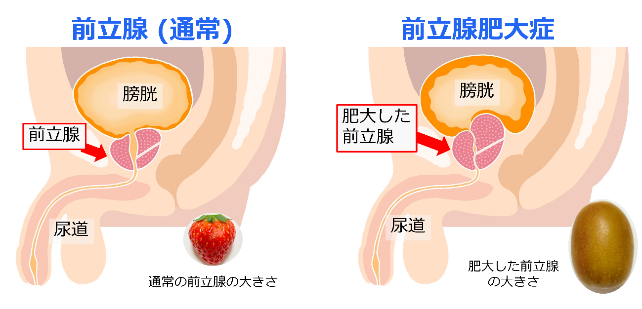 前立腺肥大症は、中高年男性に多くみられる尿トラブルの代表的な原因です。前立腺は膀胱の出口で尿道を取り囲んでおり、加齢に伴って肥大すると「尿の勢いが弱い」「残尿感がある」「尿意を催すと我慢できない」「夜間に何度もトイレのために起きてしまう」などの症状が生じます。放置すると、膀胱機能の低下や尿閉(おしっこが全く出ずに苦しい)、腎障害につながることもあり、進行性疾患としての理解が重要です。