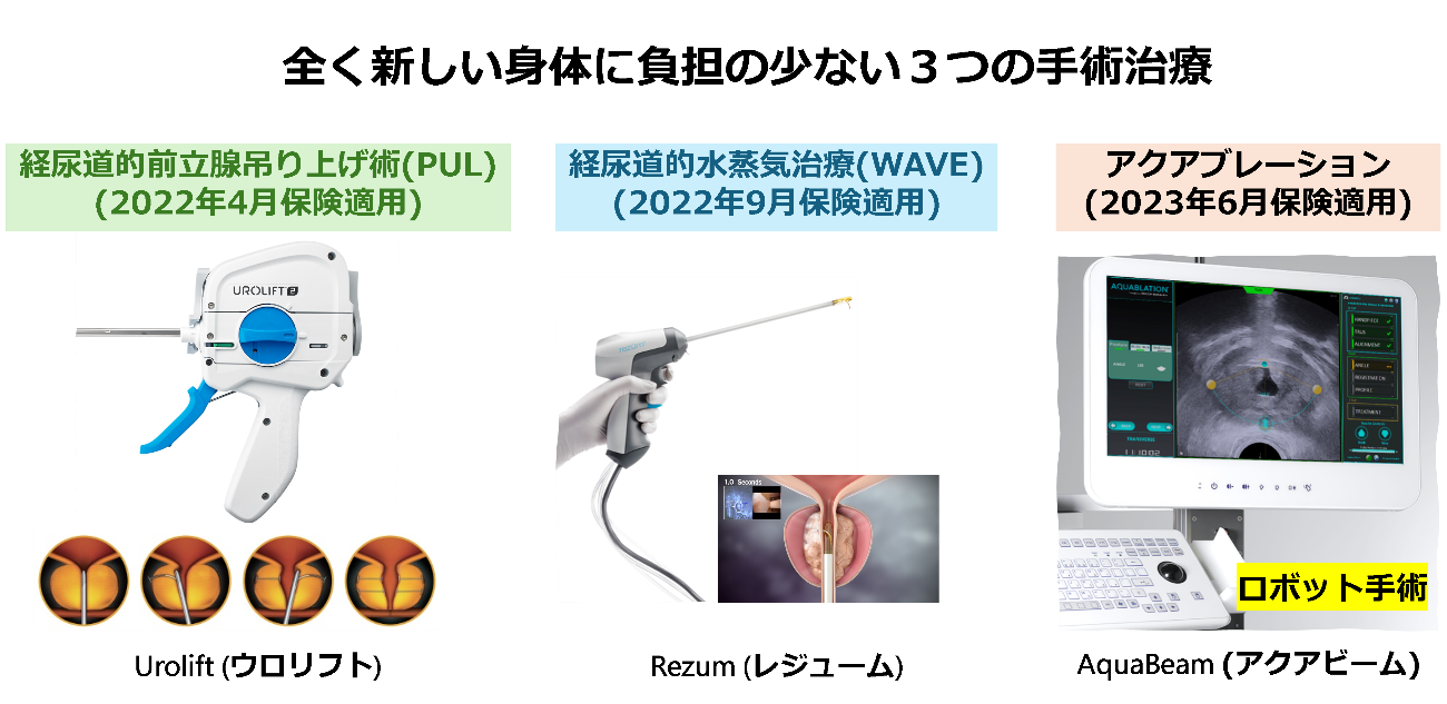 ロボット制御による高圧水流で前立腺を切除する最新技術です。日本には2025年9月現在 11台が稼働しています。手術時間が短く、術後の尿もれが少なく、射精・勃起機能の温存率も高いことが特徴です。