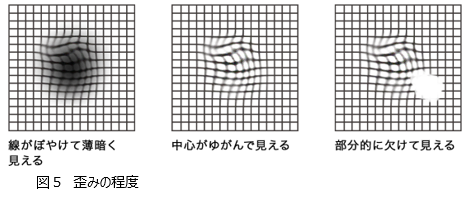 加齢黄斑変性の病状によって様々な視力低下を引き起こします。基本的には視力が低下するのが特徴ですが、黄斑に水がたまる(網膜の“むくみ“が出る)と “変視” といって物が歪んで見えたり、網膜に大きな出血が起こると “中心暗点” といって、真ん中だけが欠けて見えなくなるといった症状や、出血が眼球内に大きくおきてくると、全体が見えなくなったりすることがあります。(図5)