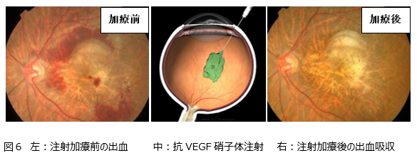 その治療には、近年主流となっている、脈絡膜新生血管を委縮させることを目的とした薬物療法である“抗VEGF硝子体注射” (図6:注射と加療前後)があり、他にもステロイド注射や、レーザーによる光線力学的療法(PDT:Photodynamic therapy)等もあります。それぞれの治療について、長所・短所があるので、担当医とよく相談して決定してださい。