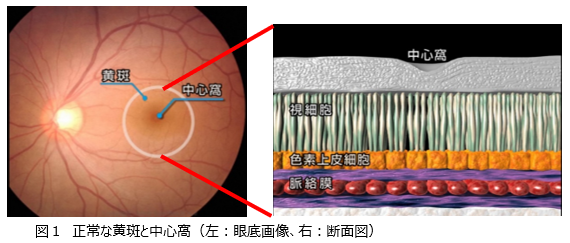 人の目には、カメラで言うところのフィルムにあたる網膜 (もうまく) という組織があり、その網膜の中心には物を見るために重要な働きをする黄斑(おうはん)という部分があります。さらに、その黄斑の中心部分は中心窩(ちゅうしんか)と言い、中心窩は周辺の網膜に比べて、視細胞(しさいぼう=光をとらえる細胞)が高密度に分布していて、文字を読んだりするための精密な働きをしています(図1)。