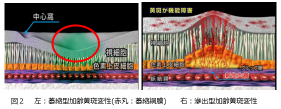 その黄斑に加齢により異常を来すのが加齢黄斑変性です。そのタイプには2種類あり、単純に視細胞が萎縮(いしゅく)することで視力が落ちる萎縮型(いしゅくがた)加齢黄斑変性(図2:左)と、出血しやすい脈絡膜新生血管(みゃくらくまくしんせいけっかん)ができて、それが破裂して網膜の中に出血や“むくみ”を引き起こして視力が低下する滲出型(しんしゅつがた)加齢黄斑変性(図2:右)があります。