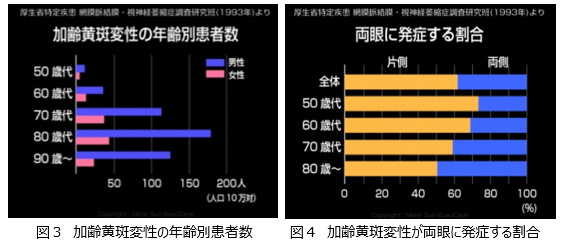 また、発症割合として男性は女性の約3倍の発症リスクがあり、名前の通り年齢に応じて発症割合が徐々に増えてゆくことも分かっています(図3)。なお、片目に発症した場合、反対側の眼にも発症する割合が40%以上もある(図4)ということで、早期発見・早期治療が重要です。
