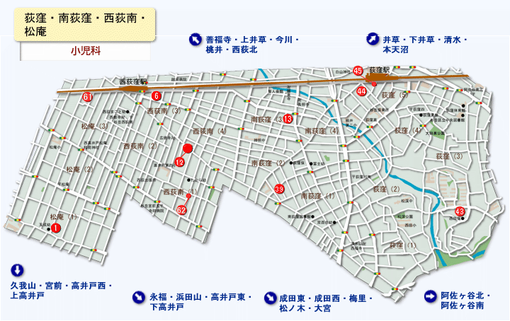 | 61 | 西荻きむらクリニック | 松庵3-20-10-102 | 03-3247-2525 | 小児科、循環器科 |